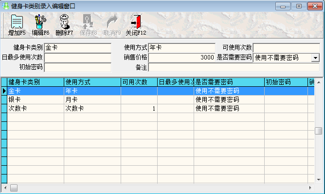 | 1.点击基本数据菜单下的健身卡类别录入编辑菜单,按增加按钮录入编辑各类类健身卡的价格和使用方式。 |