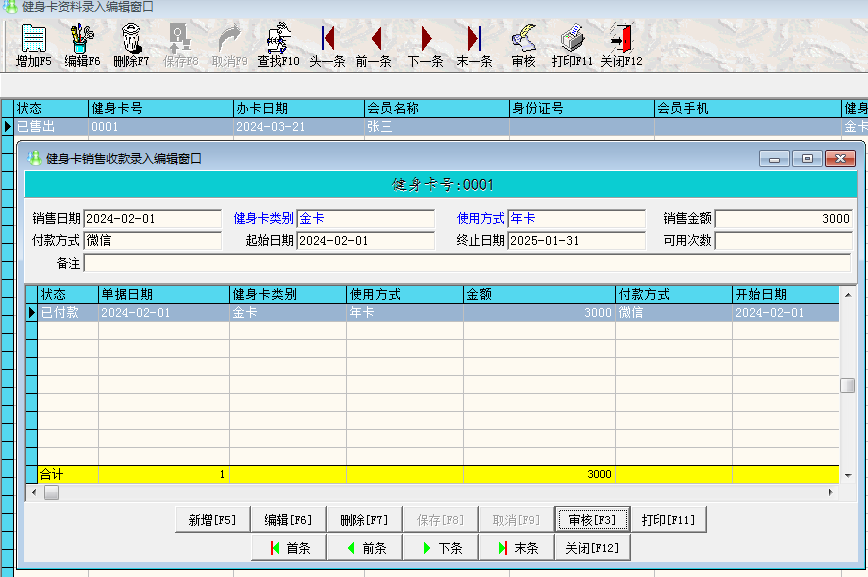 | 4.在健身卡资料录入编辑窗口下面也有健身卡销售收款按钮,点击健身卡销售收款按钮可以录入或查看该健身卡的销售收款记录。 |