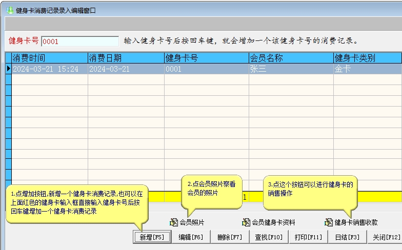 | 4.每日健身卡的使用在健身卡消费记录录入编辑窗口,见下图。 |